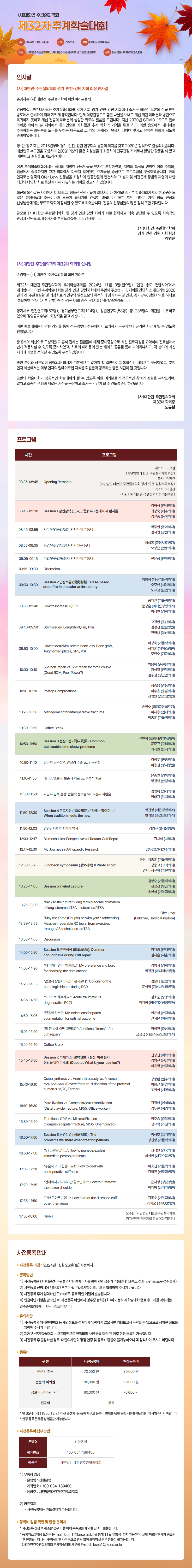 국내 학술행사 [대한견주관절의학회] 제32차 추계 학술대회 사전 등록 안내 학회사무실 2024-10-10 조회수 : 1022 Link URL : 첨부파일 제32차 추계 학술대회 웹 팜플렛 최종.jpg (다운 61건) 목록