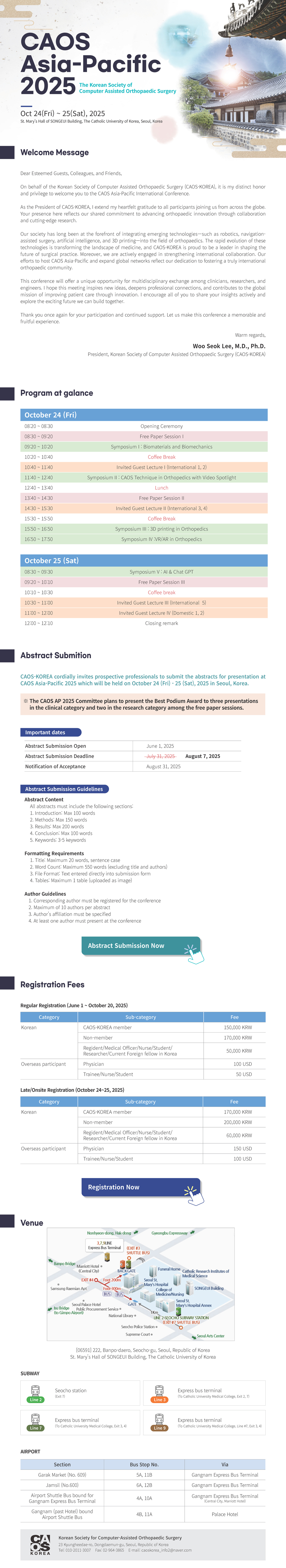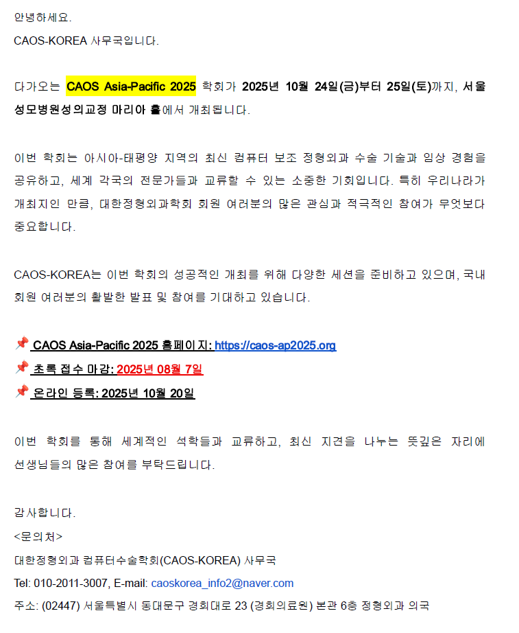 국제 학술행사 대한정형외과컴퓨터수술학회 국제학술대회(CAOS Asia-Pacific 2025) 개최 안내 학회사무실 2025-08-07 조회수 : 432 Link URL : 목록 수정 삭제
