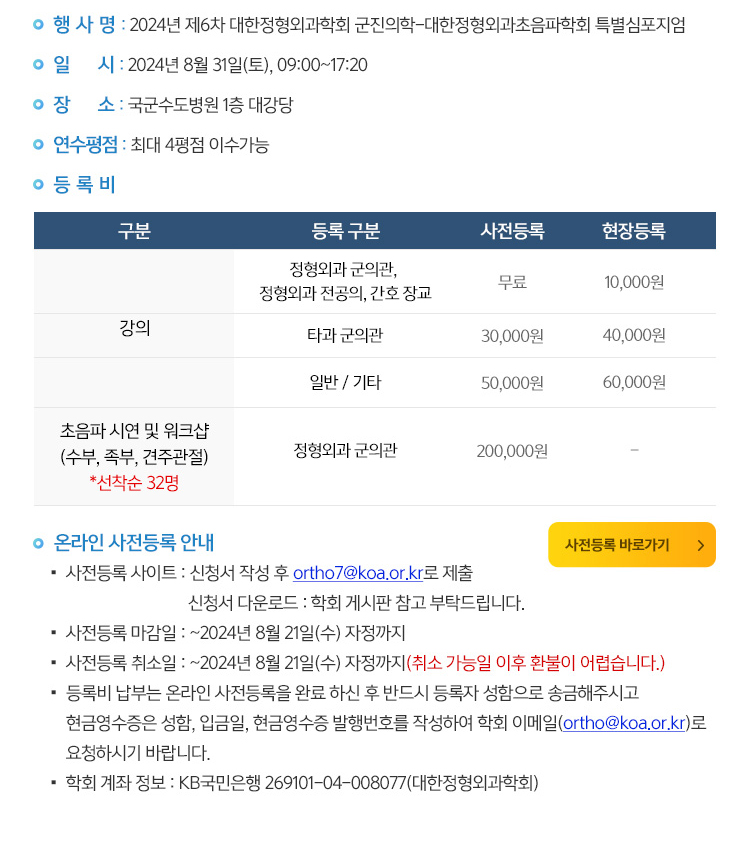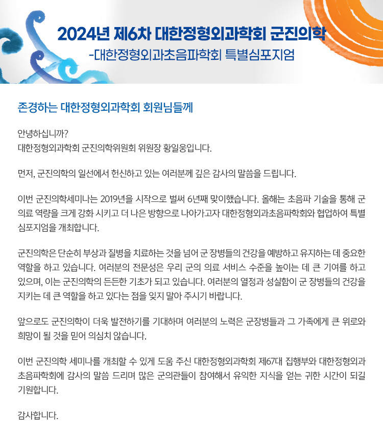 ENGLISH 학회소개 회장 인사 연혁 정관 전략체계 임원진 위원회 지회 분과 및 관련학회 산하단체 Contact us 학술행사 대한정형외과학회 국내 학술행사 국제 학술행사 학술상 행사사진 게시판 공지사항 학회소식지 보험소식 연중행사 회원공간 정형외과 발전사업 학회지 JKOA CIOS 교육 및 수련 수련병원 공지 온라인 교육센터 온라인 전공의 기록부 전공의 수련실태조사 자료실 국내 학회지 KoreaMed논문검색 의학용어 검색 학회사료 회복치료소견서 일반인 공간 병원찾기 건강 캠페인 건강정보 전체 메뉴 닫기