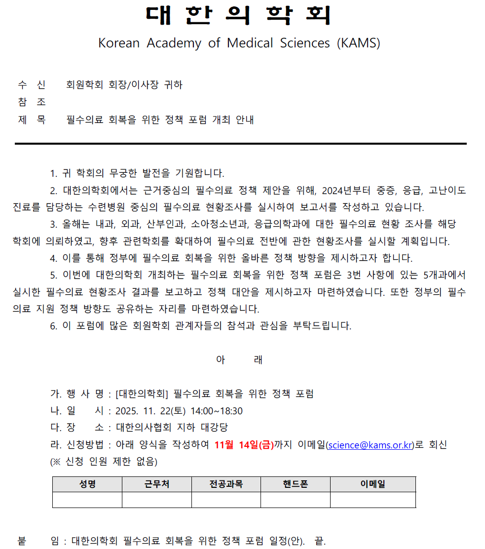 학회 주요 공지 [대한의학회] 필수의료 회복을 위한 정책 포럼 개최 안내 학회사무실 2025-10-20 조회수 : 60 Link URL : 첨부파일 2025-536(20251016)_2025 대한의학회 필수의료 회복을 위한 정책 포럼 개최 안내.pdf (다운 9건) 2025-536(20251016)_붙임-대한의학회 필수의료 회복을 위한 정책 포럼 일정(안).pdf (다운 11건) 목록
