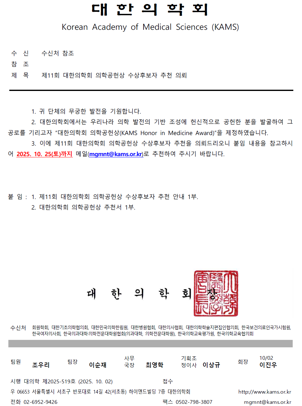 학회 주요 공지 [대한의학회] 제11회 대한의학회 의학공헌상 수상후보자 추천 의뢰 학회사무실 2025-10-20 조회수 : 43 Link URL : 첨부파일 2025-519(20251002)_제11회 대한의학회 의학공헌상 수상후보자 추천 의뢰.pdf (다운 12건) 2025-519(20251002)_붙임1-제11회 대한의학회 의학공헌상 수상후보자 추천 안내.pdf (다운 15건) 2025-519(20251002)_붙임2-대한의학회 의학공헌상 추천서.hwp (다운 11건) 목록