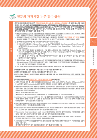 %uc815%ud615%uc678%uacfc%ud559%ud68c%uc18c%uc2dd11%uc804%ubb38%uc758 %uc790%uaca9%uc2dc%ud5d8 %ub17c%ubb38 %uc810%uc218 %uaddc%uc815%uaddc%uc8151. %uc804%ubb38%uc758 %uc790%uaca9%uc2dc%ud5d8 %uc751%uc2dc %uc790%uaca9 %uc694%uac74%uc740 %uc804%ubb38%uc758 %uc790%uaca9%uc2dc%ud5d8 %uc751%uc2dc %uc11c%ub958 %uc811%uc218 %ub9c8%uac10%uc77c%uc2dc %uc774%uc804%uae4c%uc9c0%uc758 %ub17c%ubb38 %uc810%uc218%uac00 %ucd5c%uc18c 3%uc810 %uc774%uc0c1%uc774 %ub418%uc5b4%uc57c %ud558%uba70, 1%ud3b8 %uc774%uc0c1%uc740 %ub300%ud55c%uc815%ud615%uc678%uacfc%ud559%ud68c%uc9c0(JKOA)%ub098 %ub300%ud55c%uc815%ud615%uc678%uacfc%ud559%ud68c %uc601%ubb38%ud559%ud68c%uc9c0(Clinics in Orthopedic Surgery) SCI(E), SCOPUS %uc800%ub110%uc5d0 %ucd9c%uac04 %ub610%ub294 %ucc44%ud0dd(accepted) %ub418%uc5b4%uc57c %ud55c%ub2e4. %ub2e8, %ud574%ub2f9 %ud559%ud68c%uc9c0%uc5d0 %uac8c%uc7ac%ub41c %ub17c%ubb38%uc740 %uc751%uc2dc%uc790%uac00 %uc18d%ud55c %ubcd1%uc6d0 %ud639%uc740 %uc18d%ud55c %uc758%ub8cc%uc6d0 %uc0b0%ud558%ubcd1%uc6d0%uc5d0%uc11c %uc791%uc131%ub41c %ub17c%ubb38%uc774%uc5b4%uc57c %ud55c%ub2e4. %uc5ec%ub7ec %ubcd1%uc6d0 %uacf5%ub3d9 %uc5f0%uad6c%uc778 %uacbd%uc6b0%uc5d0%ub294 %uc801%uc808%ud55c %uc2ec%uc0ac%ub97c %ud558%uc5ec %uacb0%uc815%ud558%uae30%ub85c %ud55c%ub2e4.(%uac19%uc740 %uc758%ub8cc%uc6d0 %uc0b0%ud558 %ubcd1%uc6d0%ub4e4%uc758 %uacf5%ub3d9 %uc5f0%uad6c%ub294 %uc81c%uc678)1) %ub300%ud55c%uc815%ud615%uc678%uacfc%ud559%ud68c%uc9c0(JKOA)%uc640 %ub300%ud55c%uc815%ud615%uc678%uacfc%ud559%ud68c %uc601%ubb38%ud559%ud68c%uc9c0(Clinics in Orthopedic Surgery), SCI(E), SCOPUS %uc800%ub110%uc5d0 %ub4f1%uc7ac%ub41c %uc815%ud615%uc678%uacfc %uad00%ub828 %ud559%uc220%uc9c0%ub294 3%uc810%uc774%uba70 %ucd9c%uac04%ub418%uac70%ub098 %ucc44%ud0dd%ub418%uba74(accepted) %uc778%uc815%ud55c%ub2e4.%u203b %uc815%ud615%uc678%uacfc %uad00%ub828 %ud559%uc220%uc9c0%uac00 %uc544%ub2cc SCI(E), SCOPUS %ub4f1%uc7ac %ud559%uc220%uc9c0%ub294 %uc81c1%uc800%uc790 %ub610%ub294 %ud1b5%uc2e0%uc800%uc790%uac00 %uc751%uc2dc %uc804%uacf5%uc758%uc640 %uac19%uc740 %ubcd1%uc6d0%uc758 %uc815%ud615%uc678%uacfc %uc18c%uc18d%uc774%uace0, %uc815%ud615%uc678%uacfc %uad00%ub828 %uc8fc%uc81c%ub97c %ub2e4%ub8ec %ub17c%ubb38%uc5d0 %ud55c%ud574 3%uc810 %uc778%uc815, %uadf8 %uc678 %ub17c%ubb38%uc740 %uc0ac%uc548%uc5d0 %ub530%ub77c %uc218%ub828%uad50%uc721%uc704%uc6d0%ud68c%uc5d0%uc11c %uc2ec%uc758%ud568.2) %ubd84%uacfc%ud559%ud68c%uc9c0 %ubc0f %uad00%ub828%ud559%ud68c%uc9c0%ub294 %ud559%uc220%uc9c0%uc758 %uc9c8%uc5d0 %ub530%ub77c %ucc28%ub4f1%uc744 %ub450%uc5b4 %uc810%uc218 %uc778%uc815%ud55c%ub2e4.%u2460 %ud604%uc7ac SCOPUS %ub4f1%uc7ac%uc9c0%ub294 3%uc810: Asian Spine journal, JBM(%uad6c,%uace8%ub300%uc0ac%ud559%ud68c%uc9c0), Knee Surgery and Related Research(%uad6c. %uc2ac%uad00%uc808%ud559%ud68c%uc9c0), Hip and pelvis(%uad6c, %uace0%uad00%uc808%ud559%ud68c%uc9c0), The Journal of Hand Surgery(Asian- Pacific Volume, APSMART Journal%u2461 %ud604%uc7ac %ud55c%uad6d%uc5f0%uad6c%uc7ac%ub2e8 %ub4f1%uc7ac%uc9c0 %ubc0f %ub4f1%uc7ac%ud6c4%ubcf4%uc9c0%ub294 2%uc810: %uace8%uc808, %uc2a4%ud3ec%uce20%uc758%ud559, %ucc99%ucd94, %uc871%ubd80%uc871%uad00%uc808, Clinics in Shoulder and Elbow(%uad6c %uacac%uc8fc%uad00%uc808%ud559 %ud68c%uc9c0), %ub958%ub9c8%ud2f0%uc2a4, %uace8%ub2e4%uacf5%uc99d, Archives of hand microsurgery(%ub300%ud55c%uc218%ubd80-%ubbf8%uc138%uc218%uc220 %ud1b5%ud569%ud559%ud68c%uc9c0), AOSM(%ub300%ud55c%uc815%ud615%uc678%uacfc%uc2a4%ud3ec%uce20%uc758%ud559%ud68c %uc601%ubb38 %ud559%ud68c%uc9c0)%u2462 %uae30%ud0c0 %uad00%ub828 %ubc0f %ubd84%uacfc %ud559%ud68c%uc9c0%ub294 1%uc810: %ucc99%ucd94%uc2e0%uae30%uc220%ud559%ud68c %ud559%ud68c%uc9c0%uc774%ub2e4.(%uae30%ud0c0 %uad00%ub828 %ubc0f %ubd84%uacfc %ud559%ud68c%uc9c0%uac00 %uc5f0%uad6c%uc7ac%ub2e8 %ub4f1%uc7ac%uc9c0 %ubc0f %ub4f1%uc7ac%ud6c4%ubcf4%uc9c0%uac00 %ub420 %uacbd%uc6b0 2%uc810 %uc778%uc815)3) %uc99d%ub840%ubcf4%uace0(Case report) %ubc0f %uc885%uc124(Review article)%uc740 %ub300%ud55c%uc815%ud615%uc678%uacfc%ud559%ud68c%uc9c0(JKOA)%uc640 %ub300%ud55c%uc815%ud615%uc678%uacfc%ud559%ud68c %uc601%ubb38%ud559%ud68c%uc9c0(Clinics in Orthopedic Surgery), SCI(E), SCOPUS%uc5d0 %ubc1c%ud45c%ub41c %uacbd%uc6b0%ub294 1%uc810%uc744 %uc778%uc815%ud558%uace0, %ud55c%uad6d%uc5f0%uad6c%uc7ac%ub2e8 %ub4f1%uc7ac%uc9c0 %ubc0f %ub4f1%uc7ac%ud6c4%ubcf4%uc9c0%ub294 0.5%uc810%uc744 %uc778%uc815. %uadf8 %uc678%uc758 %ubd84%uacfc %ubc0f %uad00%ub828%ud559%ud68c%uc9c0%ub294 %uc778%uc815%ud558%uc9c0 %uc54a%uc74c.4) %uc0c1%uae30 %uc810%uc218%ub294 %ud544%uc694%uc5d0 %ub530%ub77c%uc11c %ub300%ud55c%uc815%ud615%uc678%uacfc%ud559%ud68c %uc774%uc0ac%ud68c%uc5d0%uc11c %ubd84%uacfc %ubc0f %uad00%ub828%ud559%ud68c%uc9c0%uc758 %uc9c8%uc744 %uc7ac%ud3c9%uac00%ud558%uc5ec %uc870%uc815%ud55c%ub2e4.2. %ub300%ud55c%uc815%ud615%uc678%uacfc%ud559%ud68c %ub610%ub294 %uad00%ub828%ud559%ud68c%uc5d0%uc11c %uad6c%uc5f0 %ub610%ub294 %ud3ec%uc2a4%ud130 1%ud3b8 %uc774%uc0c1%uc744 %ubc1c%ud45c%ud558%uc5ec%uc57c %ud55c%ub2e4.3. %uc804%ubb38%uc758 %uc790%uaca9%uc2dc%ud5d8%uc5d0 %uc751%uc2dc%ud558%uae30 %uc704%ud574%uc11c%ub294 1%ud56d%uacfc 2%ud56d%uc744 %ubaa8%ub450 %ucda9%uc871%ud558%uc5ec%uc57c %ud55c%ub2e4.4. %ubaa8%ub4e0 %ub17c%ubb38%uc5d0%uc11c %uc804%uacf5%uc758 2%uc778%uae4c%uc9c0%ub9cc %uc778%uc815%ud558%uace0 %ubc30%uc815%ub41c %uc810%uc218%ub97c %uc804%uacf5%uc758 %uc218%ub85c %ub098%ub208 %uc810%uc218%ub97c %uc778%uc815%ud55c%ub2e4.(%uc774 %uae30%uc900%uc740 2025%ub144%ub3c4 %uc804%ubb38%uc758 %uc790%uaca9%uc2dc%ud5d8%ubd80%ud130 %uc801%uc6a9)%ube44%uace0%uc0c1%uae30%uc758 %uc218%uc815 %ubcf4%uc644%ub41c %uc0ac%ud56d%uc740 2025%ub144%ub3c4%ubd80%ud130 %uc2dc%ud589%ub418%ub294 %uc804%ubb38%uc758 %uc790%uaca9%uc2dc%ud5d8%ubd80%ud130 %uc801%uc6a9%ud55c%ub2e4.%u203b %uc804%ubb38%uc758 %uc790%uaca9%uc2dc%ud5d8 %uc694%uac74 %uc911 %ub17c%ubb38%uc740 %ub300%ud55c%uc815%ud615%uc678%uacfc%ud559%ud68c%uc9c0(JKOA), CiOS, SCI(E), SCOPUS %ud559%uc220%uc9c0%ub294 %ucc44%ud0dd(accepted)%ub418%uac70%ub098 E-pub%ub41c %uacbd%uc6b0 %ubc1c%uac04(Printed public