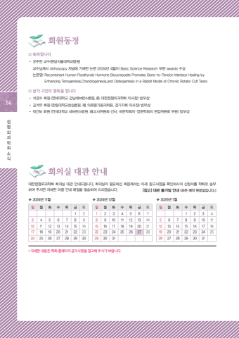 14%uc815%ud615%uc678%uacfc%ud559%ud68c%uc18c%uc2dd%ud68c%uc6d0%ub3d9%uc815%u00a4 %ucd95%ud558%ud569%ub2c8%ub2e4%u2022 %uc624%uc8fc%ud55c %uad50%uc218(%ubd84%ub2f9%uc11c%uc6b8%ub300%ud559%uad50%ubcd1%uc6d0)%uad50%uc218%ub2d8%uaed8%uc11c Atrhoscopy %uc800%ub110%uc5d0 %uae30%uc7ac%ud55c %ub17c%ubb38 (2024%ub144 4%uc6d4)%uc774 Basic Science Research %ubd80%ubd84 awards %uc218%uc0c1%ub17c%ubb38%uba85: Recombinant Human Parathyroid Hormone Biocomposite Promotes Bone-to-Tendon Interface Healing by Enhancing Tenogenesis,Chondrogenesis,and Osteogenesis in a Rabbit Model of Chronic Rotator Cuff Tears%u00a4 %uc0bc%uac00 %uace0%uc778%uc758 %uba85%ubcf5%uc744 %ube55%ub2c8%ub2e4%u2022 %uc11d%uacbd%uc218 %ud68c%uc6d0 (%uc5f0%uc138%ub300%ud559%uad50 %uac15%ub0a8%uc138%ube0c%ub780%uc2a4%ubcd1%uc6d0, %u524d %ub300%ud55c%uc815%ud615%uc678%uacfc%ud559%ud68c %uc774%uc0ac%uc7a5) %ube59%ubd80%uc0c1%u2022 %uae40%uc11d%uc6b0 %ud68c%uc6d0 (%ud55c%ub9bc%ub300%ud559%uad50%uc131%uc2ec%ubcd1%uc6d0, %u73fe %uc758%ub8cc%ud3c9%uac00%uc724%ub9ac%uc704%uc6d0, %uacbd%uae30%uc9c0%ud68c %uc774%uc0ac%uc7a5) %ube59%ubd80%uc0c1%u2022 %ubc15%uac74%ubcf4 %ud68c%uc6d0 (%uc5f0%uc138%ub300%ud559%uad50 %uc138%ube0c%ub780%uc2a4%ubcd1%uc6d0, %u73fe%uace0%uc2dc%uc704%uc6d0%ud68c %uac04%uc0ac, %uad6d%ubb38%ud559%ud68c%uc9c0%u00b7%uc601%ubb38%ud559%ud68c%uc9c0 %ud3b8%uc9d1%uc704%uc6d0%ud68c %uc704%uc6d0) %ube59%ubd80%uc0c1%ud68c%uc758%uc2e4 %ub300%uad00 %uc548%ub0b4%ub300%ud55c%uc815%ud615%uc678%uacfc%ud559%ud68c %ud68c%uc758%uc2e4 %ub300%uad00 %uc548%ub0b4%ub4dc%ub9bd%ub2c8%ub2e4. %ud68c%uc758%uc2e4%uc774 %ud544%uc694%ud558%uc2e0 %ud68c%uc6d0%uaed8%uc11c%ub294 %uc544%ub798 %ucc38%uace0%uc0ac%ud56d%uc744 %ud655%uc778%ud558%uc2dc%uc5b4 %uc2e0%uccad%uc11c%ub97c %ud559%ud68c%ub85c %uc1a1%ubd80%ud558%uc5ec %uc8fc%uc2dc%uba74 %uc790%uc138%ud55c %uc774%uc6a9 %uc548%ub0b4 %uba54%uc77c%uc744 %ubc1c%uc1a1%ud558%uc5ec %ub4dc%ub9ac%uaca0%uc2b5%ub2c8%ub2e4. [%ucc38%uace0] %ub300%uad00 %ubd88%uac00%uc77c %uc548%ub0b4 (%u2592%uc740 %uc608%uc57d %uc644%ub8cc%uc77c%uc785%ub2c8%ub2e4.)%u2756 2024%ub144 12%uc6d4 %uc77c %uc6d4 %ud654 %uc218 %ubaa9 %uae08 %ud1a01 2 3 4 5 6 78 9 10 11 12 13 1415 16 17 18 19 20 2122 23 24 25 26 27 2829 30 31%u2756 2025%ub144 1%uc6d4 %uc77c %uc6d4 %ud654 %uc218 %ubaa9 %uae08 %ud1a01 2 3 45 6 7 8 9 10 1112 13 14 15 16 17 1819 20 21 22 23 24 2526 27 28 29 30 31%u2756 2024%ub144 11%uc6d4 %uc77c %uc6d4 %ud654 %uc218 %ubaa9 %uae08 %ud1a01 23 4 5 6 7 8 910 11 12 13 14 15 1617 18 19 20 21 22 2324 25 26 27 28 29 30* %uc790%uc138%ud55c %ub0b4%uc6a9%uc740 %ud559%ud68c %ud648%ud398%uc774%uc9c0 %uacf5%uc9c0%uc0ac%ud56d%uc744 %ucc38%uace0%ud574 %uc8fc%uc2dc%uae30 %ubc14%ub78d%ub2c8%ub2e4.