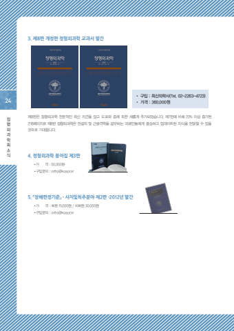 24%uc815%ud615%uc678%uacfc%ud559%ud68c%uc18c%uc2dd3. %uc81c8%ud310 %uac1c%uc815%ud310 %uc815%ud615%uc678%uacfc%ud559 %uad50%uacfc%uc11c %ubc1c%uac04%u2022 %uad6c%uc785 : %ucd5c%uc2e0%uc758%ud559%uc0ac(Tel. 02-2263-4723)%u2022 %uac00%uaca9 : 360,000%uc6d0%uc81c8%ud310%uc740 %uc815%ud615%uc678%uacfc%ud559 %uc804%ubb38%uc801%uc778 %ucd5c%uc2e0 %uc9c0%uacac%uc744 %ub2f4%uace0 %ub3c4%ud45c%uc640 %uc99d%ub840 %ub610%ud55c %uc0c8%ub86d%uac8c %ucd94%uac00%ub418%uc5c8%uc2b5%ub2c8%ub2e4. %uc81c7%ud310%uc5d0 %ube44%ud574 20% %uc774%uc0c1 %uc99d%uac00%ub41c 2118%ud398%uc774%uc9c0%ub85c %uc81c8%ud310 %uc815%ud615%uc678%uacfc%ud559%uc740 %uc804%uacf5%uc758 %ubc0f %uadfc%uace8%uaca9%ud559%uc744 %uacf5%ubd80%ud558%ub294 %uc758%ub8cc%uc778%ub4e4%uc5d0%uac8c %ud48d%uc131%ud558%uace0 %uc5c5%ub370%uc774%ud2b8%ub41c %uc9c0%uc2dd%uc744 %uc804%ub2ec%ud560 %uc218 %uc788%uc744 %uac83%uc73c%ub85c %uae30%ub300%ud569%ub2c8%ub2e4.4. %uc815%ud615%uc678%uacfc%ud559 %uc6a9%uc5b4%uc9d1 %uc81c3%ud310 %u2022%uac00 %uaca9 : 50,000%uc6d0%u2022%uad6c%uc785%ubb38%uc758 : ortho@koa.or.kr5. %u300c%uc7a5%ud574%ud310%uc815%uae30%uc900%u300d - %uc0ac%uc9c0%ubc0f%ucc99%ucd94%ubd84%uc57c %uc81c2%ud310 -2012%ub144 %ubc1c%uac04%u2022%uac00 %uaca9 : %ud68c%uc6d0 15,000%uc6d0 / %ube44%ud68c%uc6d0 30,000%uc6d0%u2022%uad6c%uc785%ubb38%uc758 : ortho@koa.or.kr27%uc815%ud615%uc678%uacfc%ud559%ud68c%uc18c%uc2dd27%ucd9c%uac04%uc18c%uc2dd1.%u0009 %uc81c2%ud310 %ud544%uc218%uc815%ud615%uc678%uacfc%ud559%ub300%ud55c%uc815%ud615%uc678%uacfc%ud559%ud68c%uc5d0%uc11c %ud544%uc218%uc815%ud615%uc678%uacfc%ud559 %uac1c%uc815%ud310(%uc81c2%ud310)%uc744 %ucd9c%uac04%ud558%uc600%uc2b5%ub2c8%ub2e4. 2007%ub144 %uc81c1%ud310 %ucd9c%uac04 %uc774%ud6c4 %ube60%ub974%uac8c %ubc1c%uc804%ud558%ub294 %uc815%ud615%uc678%uacfc%ud559%uc758 %ucd5c%uc2e0%uc9c0%uacac%uacfc %uce58%ub8cc%ubc29%ubc95%ub4e4%uc744 %uc218%ub85d%ud558%uc5ec %uc815%ud615%uc678%uacfc%uc5d0%uc11c %ubc18%ub4dc%uc2dc %uc2b5%ub4dd%ud574%uc57c %ud560 %uc758%ud559%uc9c0%uc2dd%uc744 %uc774%ud574%ud558%uae30 %uc27d%uac8c %uae30%uc220%ud558%uc600%uc2b5%ub2c8%ub2e4. %uc815%ud615%uc678%uacfc%ub97c %ub110%ub9ac %uc18c%uac1c%ud558%uace0 %uae30%ubcf8%uc801%uc778 %uc815%ud615%uc678%uacfc%ud559%uc758 %uc9c0%uc2dd%uc744 %uc804%ub2ec%ud558%ub294%ub370 %ucda9%ubd84%ud55c %uad50%uacfc%uc11c%ub85c%uc11c %uc758%uacfc%ub300%ud559 %ud559%uc0dd, %uc77c%ubc18%uc758%uc0ac, %uae30%ud0c0%uc758%ub8cc%uc778%ub4e4%uc5d0%uac8c %ud070 %ub3c4%uc6c0%uc774 %ub420 %uac83%uc785%ub2c8%ub2e4.%u2022 %uac00 %uaca9 : 60,000%uc6d0%u2022 %uc785%uae08%uacc4%uc88c : %uad6d%ubbfc%uc740%ud589 003-01-0571-043%u2022 %uad6c%uc785%uc740 %ucd5c%uc2e0%uc758%ud559%uc0ac(Tel. 02-2263-4723)%uc5d0%uc11c %uad6c%uc785%ud558%uc2e4 %uc218 %uc788%uc2b5%ub2c8%ub2e4.2.%u0009%uc815%ud615%uc678%uacfc%ud559 %uc6a9%uc5b4%uc9d1 %uc81c3%ud310%ub300%ud55c%uc815%ud615%uc678%uacfc%ud559%ud68c%uc5d0%uc11c %ud6cc%ub96d%ud558%uc2e0 %uc5ec%ub7ec %uc120%ubc30%ud68c%uc6d0%ub2d8%ub4e4%uc758 %ub178%uace0%ub85c 1989%ub144 10%uc6d4 %uc815%ud615%uc678%uacfc%ud559%uc6a9%uc5b4%uc9d1 %uc81c1%ud310%uc774 %ubc1c%uac04. 1997%ub144 10%uc6d4 %uc81c2%ud310%uc774 %ubc1c%uac04%ub41c %ud6c4 10%ub144%uc5ec%uc758 %uc138%uc6d4%uc774 %ud758%ub7ec %uac70%uc758 %uc0ac%uc6a9%uce58 %uc54a%ub294 %uc6a9%uc5b4%ub3c4 %uc0dd%uaca8%ub098%uace0 %uc815%ud615%uc678%uacfc%ud559%uc758 %ubc1c%ub2ec%ub85c %uc218%ub9ce%uc740 %uc0c8%ub85c%uc6b4 %uc6a9%uc5b4%uc758 %ud0c4%uc0dd%uc73c%ub85c %uc6a9%uc5b4%uc9d1 %uac1c%uc815%uc758 %ud544%uc694%uc131%uc774 %ub300%ub450%ub418%uc5b4 %uc81c 2%ud310%uc5d0 %ub204%ub77d%ub41c %uc6a9%uc5b4 %ubc0f %uc0c8%ub85c%uc774 %ud0c4%uc0dd%ud55c %uc6a9%uc5b4%uc758 %ubcf4%uc644%uacfc %uc0ac%uc6a9%uce58 %uc54a%ub294 %uc6a9%uc5b4(%ud3d0%uc5b4)%ub97c %uc0ad%uc81c%ud558%uace0 %uc77c%ubcf8%uc2dd %uc6a9%uc5b4%ub3c4 %uc6b0%ub9ac%ub9d0 %uc6a9%uc5b4%ub85c %uac1c%uc815%ud558%uc5ec %ucd9c%uac04%ud558%uc600%uc2b5%ub2c8%ub2e4.%u2022 %uac00 %uaca9 : 50,000%uc6d0%u2022 %uc785%uae08%uacc4%uc88c : %uad6d%ubbfc%uc740%ud589 269101-04-008077 (%uc608%uae08%uc8fc : %ub300%ud55c%uc815%ud615%uc678%uacfc%ud559%ud68c)3.%u0009 %u300c%uc7a5%ud574%ud310%uc815%uae30%uc900%u300d - %uc0ac%uc9c0%ubc0f%ucc99%ucd94%ubd84%uc57c- %uac1c%uc815%ud310%ubc1c%uac04%uc7a5%ud574%ud310%uc815%uc744 %ud558%ub294 %uc815%ud615%uc678%uacfc%ud559%ud68c %ud68c%uc6d0 %ubfd0%ub9cc %uc544%ub2c8%ub77c %uc7a5%ud574%ud310%uc815%uc744 %ud544%uc694%ub85c %ud558%ub294 %ub2e4%ub978 %uacfc%uc758 %uc758%uc0ac %uc120%uc0dd%ub2d8%uc740 %ubb3c%ub860, %uc0ac%ud68c%uc5d0%uc11c %ubc30%uc0c1 %ubc0f %ubcf4%uc0c1%ubd84%uc57c%uc5d0 %uc885%uc0ac%ud558%uc2dc%ub294 %ubd84%uacfc %ubc95%uc870%uacc4 %ub4f1%uc5d0%uc11c%ub3c4 %uad11%ubc94%uc704%ud558%uac8c %ud1b5%uc6a9%ub420 %uc218 %uc788%ub3c4%ub85d %uc5ec%ub7ec%ucc28%ub840%uc758 %ud68c%uc758%uc640 %uc6cc%ud06c%uc0f5%uc5d0%uc11c%uc758 %ud1a0%ub860%uc744 %ud1b5%ud574 2005%ub144 %ucd08%ud310 %uc774%ud6c4 %uccab %uac1c%uc815%ud310%uc744 %ubc1c%uac04%ud558%uac8c %ub418%uc5c8%uc2b5%ub2c8%ub2e4.%u2022 %uac00 %uaca9 : %ud68c%uc6d0 15,000%uc6d0/ %ube44%ud68c%uc6d0 30,000%uc6d0%u2022 %uc785%uae08%uacc4%uc88c : %uad6d%ubbfc%uc740%ud589 269101-04-008077 (%uc608%uae08%uc8fc : %ub300%ud55c%uc815%ud615%uc678%uacfc%ud559%ud68c)4. %uc815%ud615%uc678%uacfc%ud559 7%ud310 %ubc1c%uac04%u2022 %uad6c %uc785 : %ucd5c%uc2e0%uc758%ud559%uc0ac(Tel. 02-2263-4723)%u2022 %uac00 %uaca9 : 300,000%uc6d0%ub300%u203b%uc0c8%ub85c %uac1c%uc815%ub41c %uc815%ud615%uc678%uacfc%ud559 7%ud310 %ub0b4%uc6a9 %uc911 %uc77c%ubd80 %uc218%uc815 %uc0ac%ud56d%uc774 %uc788%uc5b4 %uc544%ub798%uc640 %uac19%uc774 %uc815%uc624%ud45c%ub97c %uacf5%uc9c0%ud569%ub2c8%ub2e4.%uc2e0%u00b7%uad6c%uc870%ubb38 %ub300%ube44%ud45cPage %uad6c%uc870%ubb38 %uc2e0%uc870%ubb3889 %uadf8 %uc678 %ub3d9%uc885%uace8%uc774%uc2dd, %uace8%uc218 %uc774%uc2dd %ubc0f %uc138%ud3ec%uc774%uc2dd %ub4f1%uc774 %uc788%ub2e4.%uadf8 %uc678 %uc790%uac00 %uace8%uc218 %uc774%uc2dd %ubc0f %uc790%uac00 %uc138%ud3ec %uc774%uc2dd %ub4f1%uc774 %uc788%ub2e4.89 %uace8%uc6d0%uc138%ud3ec %uace8%uc870%uc0c1%uc138%ud3ec89%uace8