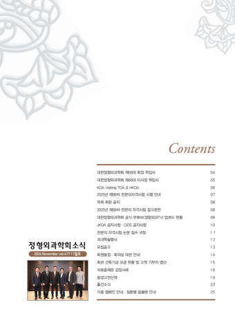 2024 November vol.417 11%uc6d4%ud638Contents%ub300%ud55c%uc815%ud615%uc678%uacfc%ud559%ud68c %uc81c68%ub300 %ud68c%uc7a5 %ucde8%uc784%uc0ac 04%ub300%ud55c%uc815%ud615%uc678%uacfc%ud559%ud68c %uc81c68%ub300 %uc774%uc0ac%uc7a5 %ucde8%uc784%uc0ac 05KOA Visiting TOA & HKOA 062025%ub144 %uc81c68%ucc28 %uc804%ubb38%uc758%uc790%uaca9%uc2dc%ud5d8 %uc2dc%ud589 %uc548%ub0b4 07%ud559%ud68c %ud68c%uc6d0 %uacf5%uc9c0 082025%ub144 %uc81c68%ucc28 %uc804%ubb38%uc758 %uc790%uaca9%uc2dc%ud5d8 %ucc38%uace0%ubb38%ud5cc 08%ub300%ud55c%uc815%ud615%uc678%uacfc%ud559%ud68c %uacf5%uc2dd %uc720%ud29c%ube0c(%uc815%ud615%uc678%uacfcTV) %uc5c5%ub85c%ub4dc %ud604%ud669 09JKOA %uacf5%uc9c0%uc0ac%ud56d%u00b7CiOS %uacf5%uc9c0%uc0ac%ud56d 1 0%uc804%ubb38%uc758 %uc790%uaca9%uc2dc%ud5d8 %ub17c%ubb38 %uc810%uc218 %uaddc%uc815 1 1%uad6d%ub0b4%ud559%uc220%ud589%uc0ac 1 2%ubaa8%uc9d1%uacf5%uace0 1 3%ud68c%uc6d0%ub3d9%uc815%u00b7%ud68c%uc758%uc2e4 %ub300%uad00 %uc548%ub0b4 1 4%ud68c%uad00 %uac74%ucd95%uae30%uae08 %ubaa8%uae08 %ud604%ud669 %ubc0f %uace0%uc561 %uae30%ubd80%uc790 %uba85%ub2e8 1 5%uc758%ub8cc%uc911%uc7ac%uc6d0 %uac10%uc815%uc0ac%ub840 1 6%ub3d9%uc591%uace0%uc804%uc0b0%ucc45 1 9%ucd9c%uac04%uc18c%uc2dd 2 2%uac01%uc885 %ucea0%ud398%uc778 %uc548%ub0b4%u00b7%uc9c8%ud658%ubcc4 %ud31c%ud50c%ub81b %uc548%ub0b4 25