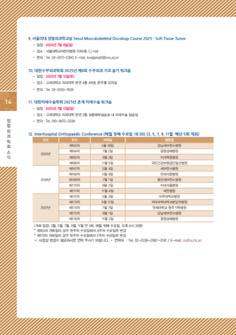 14%uc815%ud615%uc678%uacfc%ud559%ud68c%uc18c%uc2dd9. %uc11c%uc6b8%uc758%ub300 %uc815%ud615%uc678%uacfc%ud559%uad50%uc2e4 Seoul Musculoskeletal Oncology Course 2025 - Soft Tissue Tumor%u2022 %uc77c%uc815 : 2025%ub144 7%uc6d4 6%uc77c(%uc77c) %u2022 %uc7a5%uc18c : %uc11c%uc6b8%ub300%ud559%uad50%uc5b4%ub9b0%uc774%ubcd1%uc6d0 %uc9c0%ud5581%uce35 CJ Hall%u2022 %ubb38%uc758 : Tel. 02-2072-2360, E-mail. lovejjjang10@snu.ac.kr10. %ub300%ud55c%uc218%ubd80%uc678%uacfc%ud559%ud68c 2025%ub144 %uc81c8%ud68c %uc218%ubd80%uc678%uacfc %uae30%ucd08 %uc220%uae30 %uc6cc%ud06c%uc20d%u2022 %uc77c%uc815 : 2025%ub144 7%uc6d4 12%uc77c(%ud1a0)%u2022 %uc7a5%uc18c : %uace0%ub824%ub300%ud559%uad50 %uc758%uacfc%ub300%ud559 %ubcf8%uad00 4%uce35 418%ud638 %uc724%uc8fc%ud64d %uac15%uc758%uc2e4%u2022 %ubb38%uc758 : Tel. 02-2030-763911. %ub300%ud55c%ubbf8%uc138%uc218%uc220%ud559%ud68c 2025%ub144 %ucd98%uacc4 %ubbf8%uc138%uc218%uc220 %uc6cc%ud06c%uc20d%u2022 %uc77c%uc815 : 2025%ub144 7%uc6d4 13%uc77c(%uc77c)%u2022 %uc7a5%uc18c : %uace0%ub824%ub300%ud559%uad50 %uc758%uacfc%ub300%ud559 %ubcf8%uad00 5%uce35 %uc2e4%uc6a9%ud574%ubd80%uc2e4%uc2b5%uc2e4 %ub0b4 %ubbf8%uc138%uc218%uc220 %uc2e4%uc2b5%uc2e4%u2022 %ubb38%uc758 : Tel. 010-9475-233812. Interhospital Orthopaedic Conference (%ub9e4%uc6d4 %uccab%uc9f8 %uc218%uc694%uc77c 18:30) (3, 5, 7, 9, 11%uc6d4 %ub9e4%ub144 5%ud68c %uac1c%ucd5c)%ub144%ub3c4%ud69f%uc218%uac1c%ucd5c%uc77c%ubcd1%uc6d0%uba852025%ub144%uc81c163%ucc285%uc6d4 28%uc77c%uac15%ub0a8%uc138%ube0c%ub780%uc2a4%ubcd1%uc6d0%uc81c164%ucc287%uc6d4 2%uc77c%uad11%uba85%uc131%uc560%ubcd1%uc6d0%uc81c165%ucc289%uc6d4 3%uc77c%uc774%ub300%ubaa9%ub3d9%ubcd1%uc6d0%uc81c166%ucc2811%uc6d4 5%uc77c%uad6d%ubbfc%uac74%uac15%ubcf4%ud5d8%uacf5%ub2e8%uc77c%uc0b0%ubcd1%uc6d02026%ub144%uc81c167%ucc283%uc6d4 4%uc77c%uc138%ube0c%ub780%uc2a4%ubcd1%uc6d0%uc81c168%ucc285%uc6d4 6%uc77c%uc5f0%uc138%uc0ac%ub791%ubcd1%uc6d0%uc81c169%ucc287%uc6d4 1%uc77c%uc6a9%uc778%uc138%ube0c%ub780%uc2a4%ubcd1%uc6d0%uc81c170%ucc289%uc6d4 2%uc77c%uc774%ub300%uc11c%uc6b8%ubcd1%uc6d0%uc81c171%ucc2811%uc6d4 4%uc77c%uc138%ub780%ubcd1%uc6d02027%ub144%uc81c172%ucc283%uc6d4 3%uc77c%uc544%uc8fc%ub300%ud559%uad50%ubcd1%uc6d0%uc81c173%ucc285%uc6d4 12%uc77c%ucc28%uc758%uacfc%ud559%ub300%ud559%uad50%ubd84%ub2f9%ucc28%ubcd1%uc6d0%uc81c174%ucc287%uc6d4 7%uc77c%uc5f0%uc138%ub300%ud559%uad50 %uc6d0%uc8fc%uae30%ub3c5%ubcd1%uc6d0%uc81c175%ucc289%uc6d4 1%uc77c%uac15%ub0a8%uc138%ube0c%ub780%uc2a4%ubcd1%uc6d0%uc81c176%ucc2811%uc6d4 3%uc77c%uad11%uba85%uc131%uc560%ubcd1%uc6d0(%uac1c%ucd5c %uc77c%uc815: 3%uc6d4, 5%uc6d4, 7%uc6d4, 9%uc6d4, 11%uc6d4 %uc5f05%ud68c,%ub9e4%uc6d4 %uccab%uc9f8 %uc218%uc694%uc77c,%uc624%ud6c46%uc2dc30%ubd84)* %uc81c163%ucc28 %uac1c%ucd5c%uc77c%uc758 %uacbd%uc6b0 %uccab%uc8fc%ucc28 %uc218%uc694%uc77c%uc5d0%uc11c 4%uc8fc%ucc28 %uc218%uc694%uc77c%ub85c %ubcc0%uacbd* %uc81c173%ucc28 %uac1c%ucd5c%uc77c%uc758 %uacbd%uc6b0 %uccab%uc8fc%ucc28 %uc218%uc694%uc77c%uc5d0%uc11c 2%uc8fc%ucc28 %uc218%uc694%uc77c%ub85c %ubcc0%uacbd%u261e %uc0ac%uc815%uc0c1 %ubcc0%uacbd%uc774 %ud544%uc694%ud558%uc2dc%uba74 %uc5f0%ub77d %uc8fc%uc2dc%uae30 %ubc14%ub78d%ub2c8%ub2e4. %u2022 %uc5f0%ub77d%ucc98 : Tel. 02-2228-2180~2181 / E-mail. os@yuhs.ac