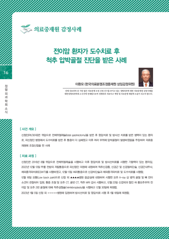 16%uc815%ud615%uc678%uacfc%ud559%ud68c%uc18c%uc2dd%uc758%ub8cc%uc911%uc7ac%uc6d0 %uac10%uc815%uc0ac%ub840%uc804%uc774%uc554 %ud658%uc790%uac00 %ub3c4%uc218%uce58%ub8cc %ud6c4 %ucc99%ucd94 %uc555%ubc15%uace8%uc808 %uc9c4%ub2e8%uc744 %ubc1b%uc740 %uc0ac%ub840%uc804%uccb4 %uc9c4%ub8cc%uacfc%ubaa9 %uc911 %uac00%uc7a5 %ub9ce%uc740 %uc758%ub8cc%ubd84%uc7c1 %uc870%uc815 %uc2e0%uccad %uac74%uc218%ub97c %ubcf4%uc774%uace0 %uc788%ub294 %uc815%ud615%uc678%uacfc%uc5d0 %ub300%ud55c %uc758%ub8cc%uc911%uc7ac%uc6d0 %uac10%uc815%uc0ac%ub840%ub97c %ub300%ud55c%uc815%ud615%uc678%uacfc%ud559%ud68c %uc18c%uc2dd%uc9c0%uc5d0 %uc5f0%uc7ac%ud568%uc73c%ub85c%uc368 %uc815%ud615%uc678%uacfc %uc758%ub8cc%uc0ac%uace0 %uc608%ubc29 %ubc0f %uc758%ub8cc%ubd84%uc7c1 %ud574%uacb0%uc5d0 %ub3c4%uc6c0%uc774 %ub418%uace0%uc790 %ud569%ub2c8%ub2e4.%uc774%ud658%ubaa8 (%ud55c%uad6d%uc758%ub8cc%ubd84%uc7c1%uc870%uc815%uc911%uc7ac%uc6d0 %uc0c1%uc784%uac10%uc815%uc704%uc6d0)[ %uc0ac%uac74 %uac1c%uc694 ]%uc2e0%uccad%uc778(%uc5ec/30%ub300)%uc740 %uc704%uc554%uc73c%ub85c %uc804%uccb4%uc704%uc808%uc81c%uc220(total gastrectomy)%uc744 %ubc1b%uc740 %ud6c4 %ud56d%uc554%uce58%ub8cc %ubc0f %ubc29%uc0ac%uc120 %uce58%ub8cc%ub97c %ubc1b%uc740 %ubcd1%ub825%uc774 %uc788%ub294 %ud658%uc790%ub85c, %ud53c%uc2e0%uccad%uc778 %ubcd1%uc6d0%uc5d0%uc11c %ub3c4%uc218%uce58%ub8cc%ub97c %ubc1b%uc740 %ud6c4 %ud1b5%uc99d%uc774 %ub354 %uc2ec%ud574%uc84c%uace0 %uc774%ud6c4 %uc5ec%ub7ec %ubd80%uc704%uc5d0 %uc555%ubc15%uace8%uc808%uc774 %ubc1c%uc0dd%ud558%uc600%uc74c%uc744 %uc8fc%uc7a5%ud558%uba70 %uc758%ub8cc%uc911%uc7ac%uc6d0%uc5d0 %uc870%uc815%uc2e0%uccad%uc744 %ud55c %uc0ac%ub840[ %uce58%ub8cc %uacfc%uc815 ]%uc2e0%uccad%uc778%uc740 2018%ub144 8%uc6d4 %uc704%uc554%uc73c%ub85c %uc804%uccb4%uc704%uc808%uc81c%uc220%uc744 %uc2dc%ud589%ud558%uace0 %uc774%ud6c4 %ud56d%uc554%uce58%ub8cc %ubc0f %ubc29%uc0ac%uc120%uce58%ub8cc%ub97c %uc2dc%ud589%ud55c %uae30%uc655%ub825%uc774 %uc788%ub294 %ud658%uc790%uc784. 2022%ub144 12%uc6d4 13%uc77c %ubb34%ub98e %uc804%ubc29%uc758 %uc800%ub9bc%ud1b5%uc99d%uc73c%ub85c %ud53c%uc2e0%uccad%uc778 %uc758%uc6d0%uc5d0 %ub0b4%uc6d0%ud558%uc5ec %ucc99%ucd94%uc2e0%uacbd%ucd1d, %uc2e0%uacbd%uadfc %ubc0f %uc2e0%uacbd%uc808%ucc28%ub2e8%uc220, %uc2e0%uacbd%uac04%ub0b4%uc8fc%uc0ac, %uccb4%uc678%ucda9%uaca9%ud30c%uce58%ub8cc(ESWT)%ub97c %uc2dc%ud589%ud558%uc600%uace0, 12%uc6d4 15%uc77c %ud5c8%ub9ac%ud1b5%uc99d%uc73c%ub85c %uc2e0%uacbd%ucc28%ub2e8%uc220%uacfc %uccb4%uc678%ucda9%uaca9%ud30c%uce58%ub8cc %ubc0f %ub3c4%uc218%uce58%ub8cc%ub97c %uc2dc%ud589%ud568.12%uc6d4 18%uc77c %uc694%ud1b5(Low back pain)%uc73c%ub85c %uc2e0%uccad %uc678 %u25b2%u25b2%u25b2%u25b2%ubcd1%uc6d0 %uc751%uae09%uc2e4%uc5d0 %ub0b4%uc6d0%ud558%uc5ec %uc2dc%ud589%ud55c %uc694%ucd94 X-ray %uc0c1 %ubcd1%uc801 %uace8%uc808 %ubc0f %ubf08 %uc804%uc774 %uc18c%uacac%uc774 %uad00%ucc30%ub418%uc5b4 %uc785%uc6d0, %ud1b5%uc99d %uc870%uc808 %ubc0f %uc694%ucd94 CT, %uace8%ubc18 CT, %ucc99%ucd94 MRI %uac80%uc0ac %uc2dc%ud589%ud558%uace0, 12%uc6d4 23%uc77c %uc2e0%uacbd%uc678%uacfc %ud611%uc9c4 %ud558 %ud749%uc694%ucd94%ubd80%uc704 %uc804%uc774%uc554 %ubc0f %uc694%ucd94 2%ubc88 %uace8%uc808%uc5d0 %ub300%ud574 %ucc99%ucd94%uc131%ud615%uc220(Vertebroplasty)%uc744 %uc2dc%ud589%ud558%uace0 12%uc6d4 30%uc77c%uc5d0 %ud1f4%uc6d0%ud568.2023%ub144 1%uc6d4 5%uc77c %uc2e0%uccad %uc678 %u25a1%u25a1%u25a1%u25a1%u25a1%ubcd1%uc6d0%uc5d0 %uc785%uc6d0%ud558%uc5ec %ubc29%uc0ac%uc120%uce58%ub8cc %ubc0f %ud56d%uc554%uce58%ub8cc %uc2dc%ud589 %ud6c4 1%uc6d4 18%uc77c%uc5d0 %ud1f4%uc6d0%ud568.