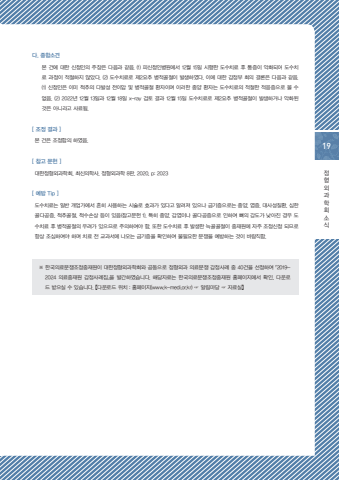 %uc815%ud615%uc678%uacfc%ud559%ud68c%uc18c%uc2dd19%ub2e4. %uc885%ud569%uc18c%uacac%ubcf8 %uac74%uc5d0 %ub300%ud55c %uc2e0%uccad%uc778%uc758 %uc8fc%uc7a5%uc740 %ub2e4%uc74c%uacfc %uac19%uc74c. (1) %ud53c%uc2e0%uccad%uc778%ubcd1%uc6d0%uc5d0%uc11c 12%uc6d4 15%uc77c %uc2dc%ud589%ud55c %ub3c4%uc218%uce58%ub8cc %ud6c4 %ud1b5%uc99d%uc774 %uc545%ud654%ub418%uc5b4 %ub3c4%uc218%uce58%ub8cc %uacfc%uc815%uc774 %uc801%uc808%ud558%uc9c0 %uc54a%uc558%ub2e4. (2) %ub3c4%uc218%uce58%ub8cc%ub85c %uc81c2%uc694%ucd94 %ubcd1%uc801%uace8%uc808%uc774 %ubc1c%uc0dd%ud558%uc600%ub2e4. %uc774%uc5d0 %ub300%ud55c %uac10%uc815%ubd80 %ud68c%uc758 %uacb0%ub860%uc740 %ub2e4%uc74c%uacfc %uac19%uc74c. (1) %uc2e0%uccad%uc778%uc740 %uc774%ubbf8 %ucc99%ucd94%uc758 %ub2e4%ubc1c%uc131 %uc804%uc774%uc554 %ubc0f %ubcd1%uc801%uace8%uc808 %ud658%uc790%uc774%uba70 %uc774%ub7ec%ud55c %uc885%uc591 %ud658%uc790%ub294 %ub3c4%uc218%uce58%ub8cc%uc758 %uc801%uc808%ud55c %uc801%uc751%uc99d%uc73c%ub85c %ubcfc %uc218 %uc5c6%uc74c. (2) 2022%ub144 12%uc6d4 13%uc77c%uacfc 12%uc6d4 18%uc77c x-ray %uac80%ud1a0 %uacb0%uacfc 12%uc6d4 15%uc77c %ub3c4%uc218%uce58%ub8cc%ub85c %uc81c2%uc694%ucd94 %ubcd1%uc801%uace8%uc808%uc774 %ubc1c%uc0dd%ud558%uac70%ub098 %uc545%ud654%ub41c %uac83%uc740 %uc544%ub2c8%ub77c%uace0 %uc0ac%ub8cc%ub428. [ %uc870%uc815 %uacb0%uacfc ]%ubcf8 %uac74%uc740 %uc870%uc815%ud569%uc758 %ud558%uc600%uc74c.[ %ucc38%uace0 %ubb38%ud5cc ]%ub300%ud55c%uc815%ud615%uc678%uacfc%ud559%ud68c, %ucd5c%uc2e0%uc758%ud559%uc0ac, %uc815%ud615%uc678%uacfc%ud559 8%ud310, 2020, p: 2023[ %uc608%ubc29 Tip ]%ub3c4%uc218%uce58%ub8cc%ub294 %uc77c%ubc18 %uac1c%uc5c5%uac00%uc5d0%uc11c %ud754%ud788 %uc0ac%uc6a9%ud558%ub294 %uc2dc%uc220%ub85c %ud6a8%uacfc%uac00 %uc788%ub2e4%uace0 %uc54c%ub824%uc838 %uc788%uc73c%ub098 %uae08%uae30%uc99d%uc73c%ub85c%ub294 %uc885%uc591, %uc5fc%uc99d, %ub300%uc0ac%uc131%uc9c8%ud658, %uc2ec%ud55c %uace8%ub2e4%uacf5%uc99d, %ucc99%ucd94%uace8%uc808, %ucc99%uc218%uc190%uc0c1 %ub4f1%uc774 %uc788%uc74c(%ucc38%uace0%ubb38%ud5cc 1). %ud2b9%ud788 %uc885%uc591, %uac10%uc5fc%uc774%ub098 %uace8%ub2e4%uacf5%uc99d%uc73c%ub85c %uc778%ud558%uc5ec %ubf08%uc758 %uac15%ub3c4%uac00 %ub0ae%uc544%uc9c4 %uacbd%uc6b0 %ub3c4%uc218%uce58%ub8cc %ud6c4 %ubcd1%uc801%uace8%uc808%uc758 %uc6b0%ub824%uac00 %uc788%uc73c%ubbc0%ub85c %uc8fc%uc758%ud558%uc5ec%uc57c %ud568. %ub610%ud55c %ub3c4%uc218%uce58%ub8cc %ud6c4 %ubc1c%uc0dd%ud55c %ub291%uace8%uace8%uc808%uc774 %uc911%uc7ac%uc6d0%uc5d0 %uc790%uc8fc %uc870%uc815%uc2e0%uccad %ub418%ubbc0%ub85c %ud56d%uc0c1 %uc870%uc2ec%ud558%uc5ec%uc57c %ud558%uba70 %uce58%ub8cc %uc804 %uad50%uacfc%uc11c%uc5d0 %ub098%uc624%ub294 %uae08%uae30%uc99d%uc744 %ud655%uc778%ud558%uc5ec %ubd88%ud544%uc694%ud55c %ubd84%uc7c1%uc744 %uc608%ubc29%ud558%ub294 %uac83%uc774 %ubc14%ub78c%uc9c1%ud568.%u203b %ud55c%uad6d%uc758%ub8cc%ubd84%uc7c1%uc870%uc815%uc911%uc7ac%uc6d0%uc774 %ub300%ud55c%uc815%ud615%uc678%uacfc%ud559%ud68c%uc640 %uacf5%ub3d9%uc73c%ub85c %uc815%ud615%uc678%uacfc %uc758%ub8cc%ubd84%uc7c1 %uac10%uc815%uc0ac%ub840 %uc911 40%uac74%uc744 %uc120%uc815%ud558%uc5ec %u300c2019-2024 %uc758%ub8cc%uc911%uc7ac%uc6d0 %uac10%uc815%uc0ac%ub840%uc9d1%u300d%uc744%ubc1c%uac04%ud558%uc600%uc2b5%ub2c8%ub2e4. %ud574%ub2f9%uc790%ub8cc%ub294 %ud55c%uad6d%uc758%ub8cc%ubd84%uc7c1%uc870%uc815%uc911%uc7ac%uc6d0 %ud648%ud398%uc774%uc9c0%uc5d0%uc11c %ud655%uc778,%ub2e4%uc6b4%ub85c%ub4dc %ubc1b%uc73c%uc2e4 %uc218 %uc788%uc2b5%ub2c8%ub2e4. %u3010%ub2e4%uc6b4%ub85c%ub4dc %uc704%uce58 : %ud648%ud398%uc774%uc9c0(www.k-medi.or.kr) %u261e %uc54c%ub9bc%ub9c8%ub2f9 %u261e %uc790%ub8cc%uc2e4%u3011