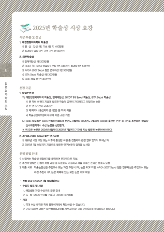 6%uc815%ud615%uc678%uacfc%ud559%ud68c%uc18c%uc2dd2025%ub144 %ud559%uc220%uc0c1 %uc2dc%uc0c1 %uc694%uac15%uc2dc%uc0c1 %ubd80%ubd84 %ubc0f %uc0c1%uae081. %ub300%ud55c%uc815%ud615%uc678%uacfc%ud559%ud68c %ud559%uc220%uc0c11) %ubcf8 %uc0c1 : %uc784%uc0c1 1%ud3b8, %uae30%ucd08 1%ud3b8 %uac01 400%ub9cc%uc6d02) %uc7a5%ub824%uc0c1 : %uc784%uc0c1 3%ud3b8, %uae30%ucd08 3%ud3b8 %uac01 100%ub9cc%uc6d02. %uc678%ubd80%ud559%uc220%uc0c11) %ub9cc%ub840%uc7ac%ub2e8%uc0c1 1%ud3b8 200%ub9cc%uc6d02) SICOT '93 Seoul %ud559%uc220%uc0c1 : %ubcf8%uc0c1 1%ud3b8 300%ub9cc%uc6d0, %uc7a5%ub824%uc0c1 1%ud3b8 100%ub9cc%uc6d03) APOA 2007 Seoul %uc80a%uc740 %uc5f0%uad6c%uc790%uc0c1 1%ud3b8 300%ub9cc%uc6d04) ISTA Seoul %ud559%uc220%uc0c1 1%ud3b8 300%ub9cc%uc6d05) CiOS %ud559%uc220%uc0c1 1%ud3b8 300%ub9cc%uc6d0%uc120%uc815 %uae30%uc9001. %ud559%uc220%ub17c%ubb38%uc0c1%uac00. %ub300%ud55c%uc815%ud615%uc678%uacfc%ud559%ud68c %ud559%uc220%uc0c1, %ub9cc%ub840%uc7ac%ub2e8%uc0c1, SICOT '93 Seoul %ud559%uc220%uc0c1, ISTA Seoul %ud559%uc220%uc0c11) %ubcf8 %ud559%ud68c %ud68c%uc6d0%uc774 %uc9c0%uc0c1%uc5d0 %ubc1c%ud45c%ud55c %ud559%uc220%uc801 %uacf5%ud5cc%uc774 %uc9c0%ub300%ud558%ub2e4%uace0 %uc778%uc815%ub418%ub294 %ub17c%ubb382) %uc8fc %uc5f0%uad6c%uae30%uad00%uc774 %uad6d%ub0b4%uae30%uad003) %uc81c1%uc800%uc790%ub098 %ud1b5%uc2e0%uc800%uc790 %uc911 1%uba85%uc740 %ubcf8 %ud559%ud68c %ud68c%uc6d04) %ud559%uc220%uc0c1%uc2ec%uc0ac%uc704%uc6d0%ud68c %ub0b4%uaddc%uc5d0 %ub530%ub978 %uc18c%uc815 %uae30%uc900%ub098. CiOS %ud559%uc220%uc0c1%uc740 CiOS %ud3b8%uc9d1%uc704%uc6d0%ud68c%uc5d0%uc11c %uc804%ub144%ub3c4 8%uc6d4%ubd80%ud130 %ud574%ub2f9%ub144%ub3c4 7%uc6d4%uae4c%uc9c0 CiOS%uc5d0 %ucd9c%uac04%ub41c %ub17c%ubb38 %uc911 3%ud3b8%uc744 %ucd94%ucc9c%ud558%uc5ec %ud559%uc220%uc0c1%uc2ec%uc0ac%uc704%uc6d0%ud68c%uc5d0%uc11c %uc218%uc0c1 %ub17c%ubb38%uc744 %uc120%uc815%ud55c%ub2e4.%u203b %uc704 %ubaa8%ub4e0 %ub17c%ubb38%uc740 2024%ub144 8%uc6d4%ubd80%ud130 2025%ub144 7%uc6d4%uae4c%uc9c0 %uae30%uac04%uc5d0 %uc9c0%uc0c1 %ubc1c%ud45c%ub41c %ub17c%ubb38%uc774%uc5b4%uc57c %ud55c%ub2e4.2. APOA 2007 Seoul %uc80a%uc740 %uc5f0%uad6c%uc790%uc0c11) 1985%ub144 10%uc6d4 17%uc77c %ub610%ub294 %uc774%ud6c4%uc5d0 %ucd9c%uc0dd%ud55c %ud68c%uc6d0 %uc911 %uc815%ud615%uc678%uacfc %uad00%ub828 %uc5f0%uad6c %uc5c5%uc801%uc774 %ub6f0%uc5b4%ub09c %uc7902) 2025%ub144 7%uc6d4 14%uc77c%uae4c%uc9c0 %uc9c0%uc0c1%uc73c%ub85c %ubc1c%ud45c%ud55c %uc5f0%uad6c%ub17c%ubb38%uc758 %uc5c5%uc801%uc744 %uc2ec%uc0ac%ud568%uc2e0%uccad %ubc29%ubc95 %uc548%ub0b41) %uc2e0%uccad%uc11c%ub294 %ud559%uc220%uc0c1 %uc2e0%uccad%ud558%uae30%ub97c %ud074%ub9ad%ud558%uc5ec %uc628%ub77c%uc778%uc73c%ub85c %uc791%uc131.2) %ucd94%ucc9c%uc11c %uc591%uc2dd%uc740 %uc2e0%uccad%uc11c %uc791%uc131 %uacfc%uc815 %uc911 %ub2e4%uc6b4%ub85c%ub4dc %uac00%ub2a5%ud558%uace0 %uc81c%ucd9c %uc11c%ub958%ub294 %uc628%ub77c%uc778 %uc5c5%ub85c%ub4dc %uc694%uccad3) %uc81c%ucd9c %uc11c%ub958 : %ud559%uc220%ub17c%ubb38%uc0c1%uc740 %uc8fc%uc784%uad50%uc218 %ub610%ub294 %uacfc%uc7a5 %ucd94%ucc9c%uc11c 1%ubd80, %ub17c%ubb38 PDF %ud30c%uc77c, APOA 2007 Seoul %uc80a%uc740 %uc5f0%uad6c%uc790%uc0c1%uc740 %uc8fc%uc784%uad50%uc218 %ub610%ub294 %uacfc%uc7a5 %ucd94%ucc9c%uc11c 1%ubd80, %ub17c%ubb38 %ubaa9%ub85d%uc5d0 %uc788%ub294 %ubaa8%ub4e0 %ub17c%ubb38 PDF %ud30c%uc77c%u2022 %uc2e0%uccad %ub9c8%uac10 : 2025%ub144 7%uc6d4 14%uc77c(%uc6d4)%uae4c%uc9c0%u2022 %uc218%uc0c1%uc790 %ubc1c%ud45c %ubc0f %uc2dc%uc0c11. %ud574%ub2f9%ubcd1%uc6d0 %uacfc%uc7a5 %uc218%uc2e0%uc73c%ub85c %uacf5%ubb38 %uc548%ub0b42. %uc2dc %uc0c1 : 2025%ub144 10%uc6d4 17%uc77c(%uae08), %uc81c70%ucc28 %uc815%uae30%ucd1d%ud68c%u2022 %uae30%ud0c01. %uc5ed%ub300 %uc218%uc0c1 %ub0b4%uc5ed%uc740 %ud559%ud68c %ud648%ud398%uc774%uc9c0%uc5d0%uc11c %ud655%uc778%ud558%uc2e4 %uc218 %uc788%uc2b5%ub2c8%ub2e4.2. %uae30%ud0c0 %uc0c1%uc138%ud55c %ub0b4%uc6a9%uc740 %ub300%ud55c%uc815%ud615%uc678%uacfc%ud559%ud68c %uc0ac%ubb34%uad6d(%u260f02-780-2765)%uc73c%ub85c %ubb38%uc758%ud558%uc2dc%uae30 %ubc14%ub78d%ub2c8%ub2e4.